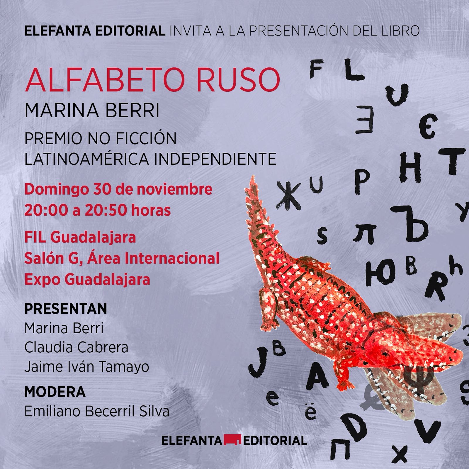 23 Dic Presentación del libro «Alfabeto ruso», de Mariana Berri Posted at 11:39h in Eventos by Claudia Cabrera FIL Guadalajara 2025, domingo 30 de noviembre Print page